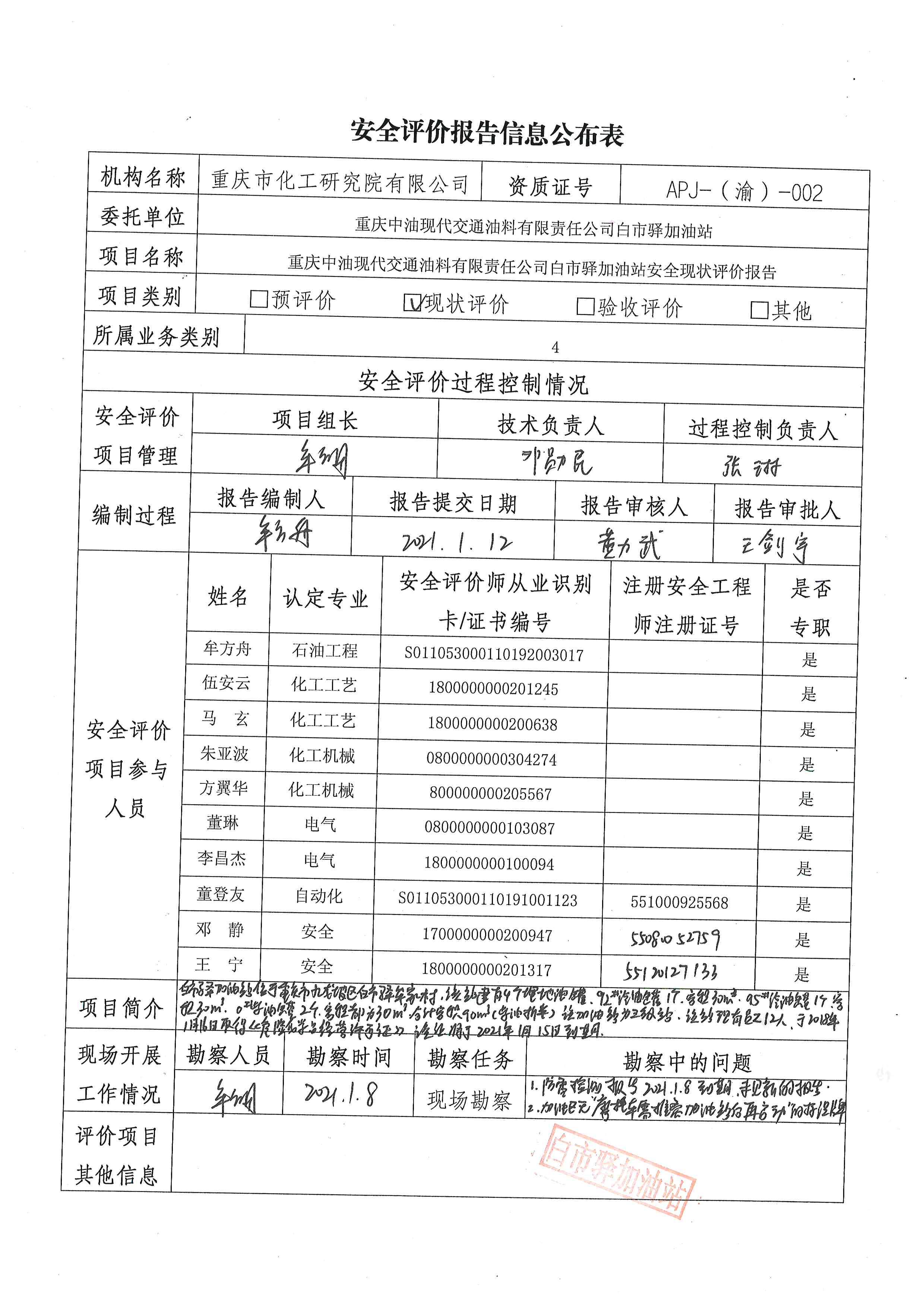 重庆中油现代交通油料有限责任公司白市驿加油站安全现状评价报告