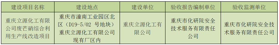 根据《国务院关于修改〈建设项目竣工环境保护管理条例〉的决定》(国务院令第682号),以及生态环境部《关于发布<建设项目竣工环境保护验收暂行办法>的公告》(国环规环评[2017]4号),现将“重庆立源化工有限公司废芒硝综合利用生产线改造项目”竣工环境保护验收公示如下: