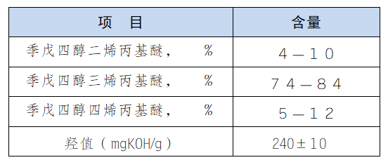 季戊四醇三烯丙基醚,英文名Pentaerythritoltriallylether ,分子 结构有三个双键和一个羟基,用于高吸水性树脂、增稠剂、不饱 和聚酯、聚氨酯树脂、环氧树脂、UV固化树脂等聚合物合成中作 交联剂,同时使聚合物具有自干性。