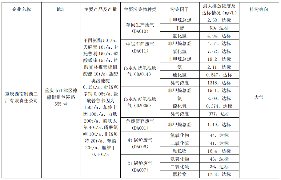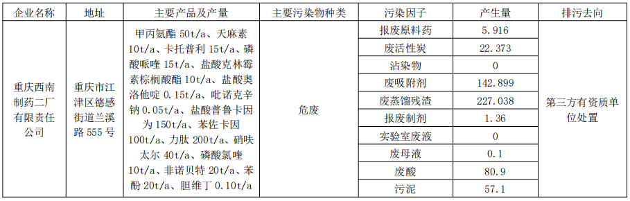 根据“《重庆市生态环境局办公室关于做好2023年清洁生产审核工作的通知》(市生态环境局办公室便函〔2023〕58号)”要求,重庆西南制药二厂有限责任公司将在2023年实施强制清洁生产审核工作。现根据《清洁生产审核办法》(国家发改委、原环保部第38号令)第十一条要求,现将我司产排污情况进行公示: