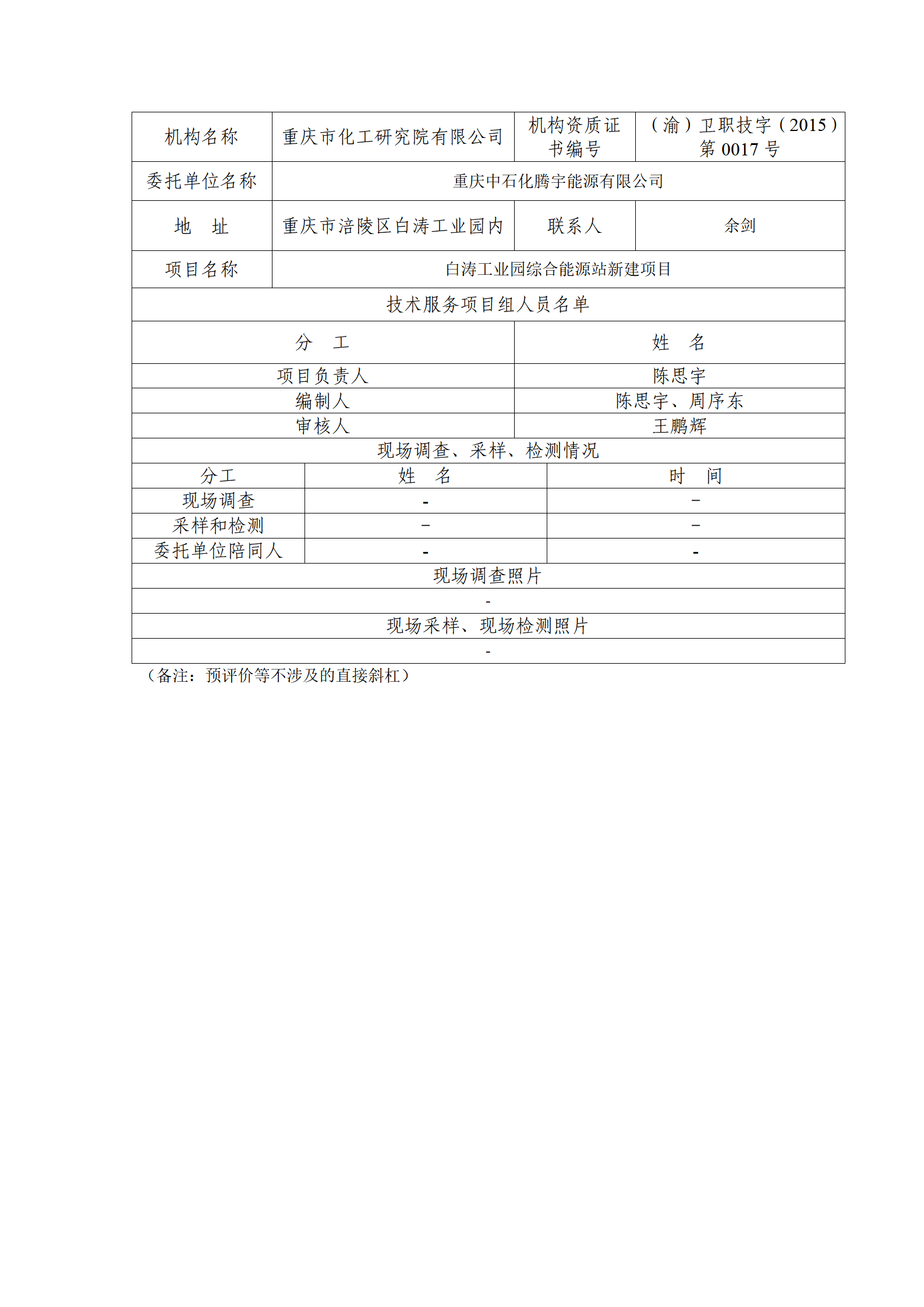 重庆中石化腾宇能源有限公司白涛工业园综合能源站新建项目职业病危害预评价报告渝化研院预评